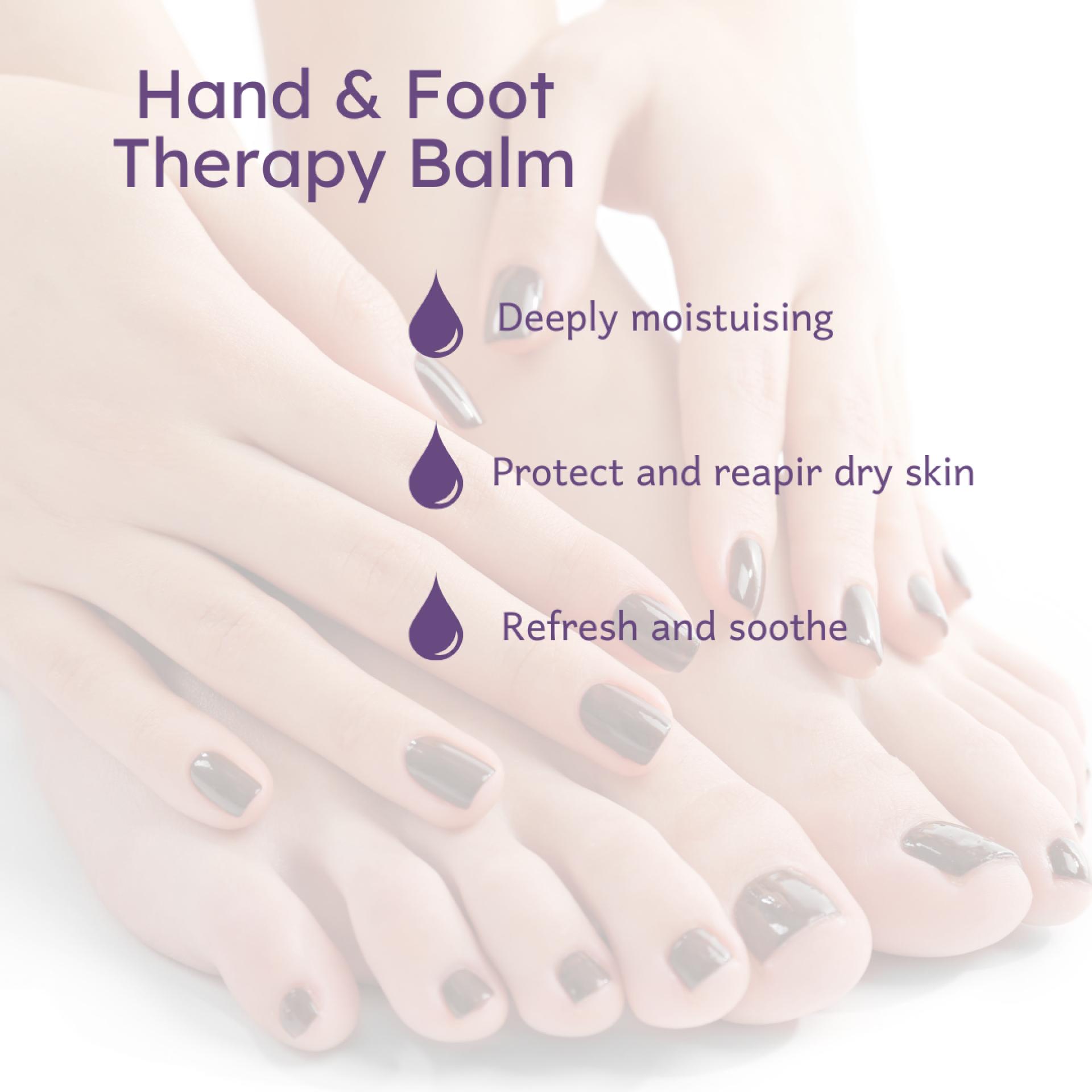 Hand & Foot Therapy Balm A deeply nourishing balm designed to soothe tired hands and aching feet. Packed with potent natural oils to calm inflammation, ease joint pain, and leave skin feeling soft, protected, and revitalised. Benefits/Concerns: Eases joint pain and muscle fatigue, deeply hydrates and soothes skin, reduces inflammation, supports circulation, provides natural antimicrobial protection. A restorative and holistic approach to hand and foot wellness. Benefit Description: Harnessing the therapeutic power of Scottish Pine, Lavender, Spearmint, and Chamomile, this balm helps relieve joint and muscle discomfort while supporting relaxation and skin repair. Ylang Ylang uplifts the mood and promotes balance, while Thistle Oil hydrates and heals even the most delicate or dry skin. Rich in antioxidants, this balm is ideal for regular use on sore, stressed, or weathered hands and feet. Usage: Massage a small amount into clean, dry hands or feet using circular motions. For joint relief, apply generously to affected areas up to four times daily. Ideal for use after a warm bath, before bed, or post-activity to calm and restore. INCI: Mangifera indica seed butter, Butyrospermum parkii butter, Carthamus tinctorius seed oil, Lavandula angustifolia flower oil, Mentha spicata herb oil, Cananga odorata flower oil, Triticum vulgare germ oil, Pinus sylvestris leaf oil, Chamomilla recutita flower oil, Tocopherol 50ml