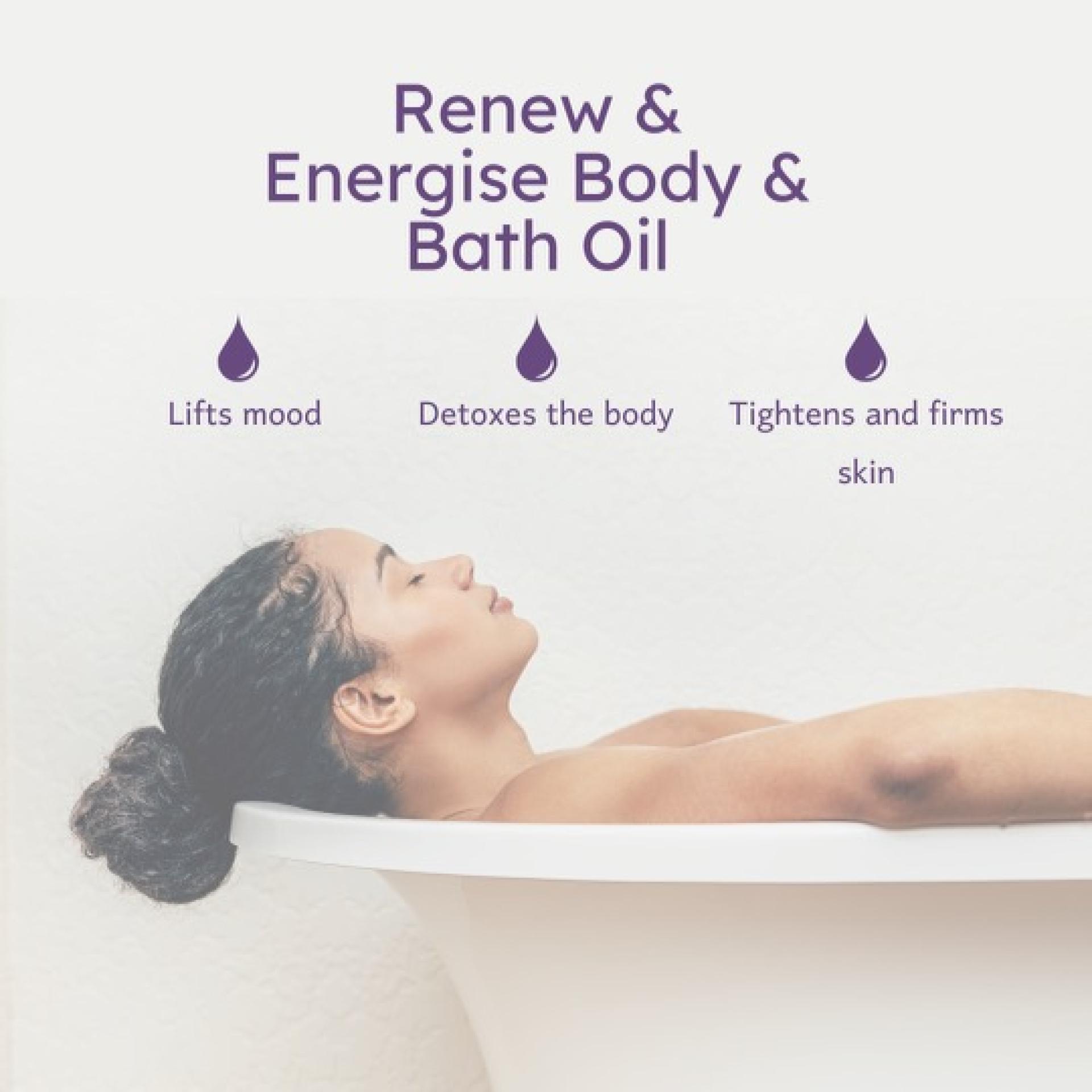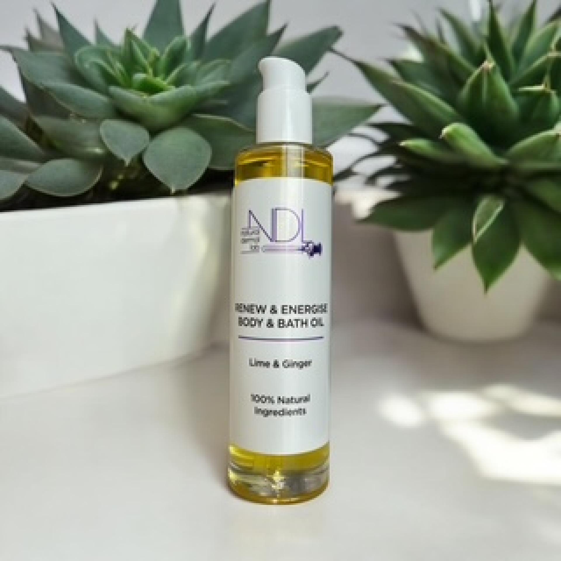Renew & Energise Body & Bath Oil A zezty up lifting scent that will lift your mood and energise the body. Benefits/Concerns: Up-lifting and stimulating scent, lifts mood, energises the body, nourishes and brightens skin. Benefit Description: This silk like feeling oil, leaves skin moisturised, deeply penetrates the skin leave no oilyness on the skin. Good for dry cracked skin types with its blend of melonseed oil, thistle oil and Vitamin E to name but a few. The sweet scent of Lime, Ginger and Junipperberry stimulate the metabolism, lifts your mood, helps with SAD disorder with its summer like scent. With diuretic properties this is the best detox support blend. Packed with natural Vitamin C, can be great for anti-aging benefits and will brighten and lift skins tone. Usage: Apply directly on the body after shower while skin is dampened or use 10 pumps in the bath and soak for 20 minutes to get full therapeutic benefits. Best suited to morning or afternoon use with its stimulating effects. INCI: Carthamus tinctorius seed oil, Oryza sativa bran oil, Citrullus vulgaris seed oil, Ricinus communis seed oil, Citrus sinensis peel oil expressed, Citrus aurantifolia peel oil, Juniperus communis fruit oil, Citrus paradisi peel oil, Tocopherol, Helianthus annuus seed oil, Mentha piperita oil, Zingiber officinale root oil 100ml